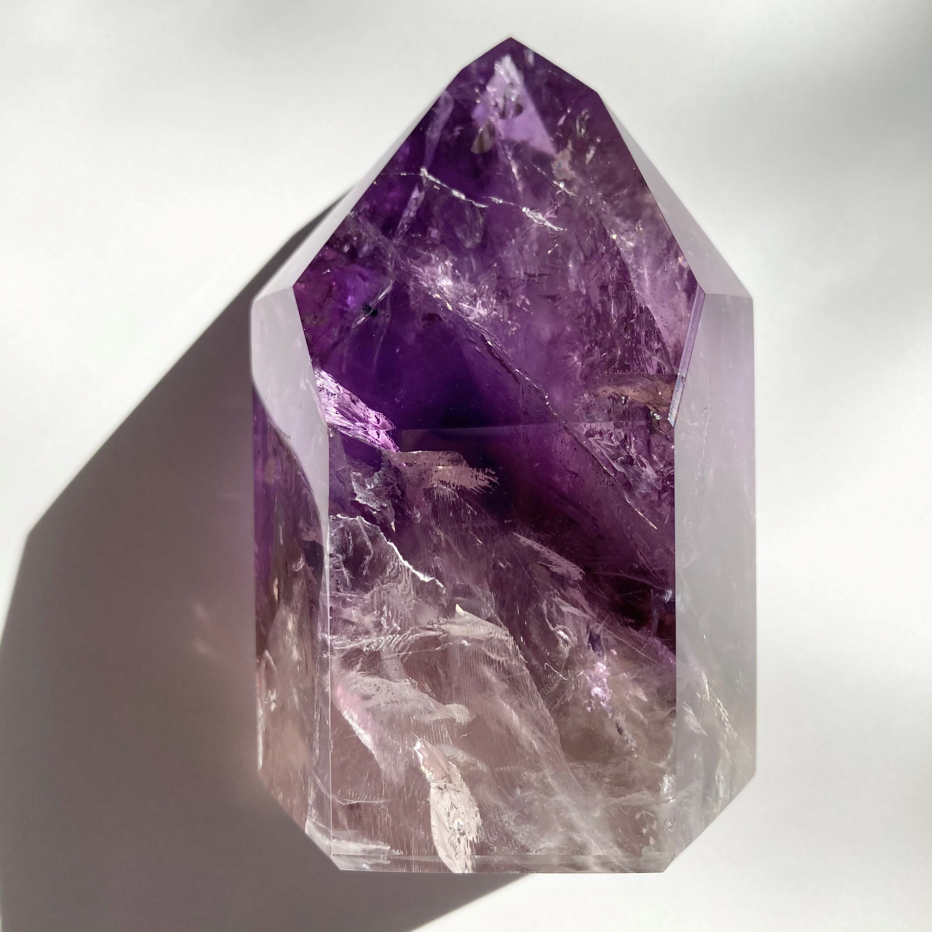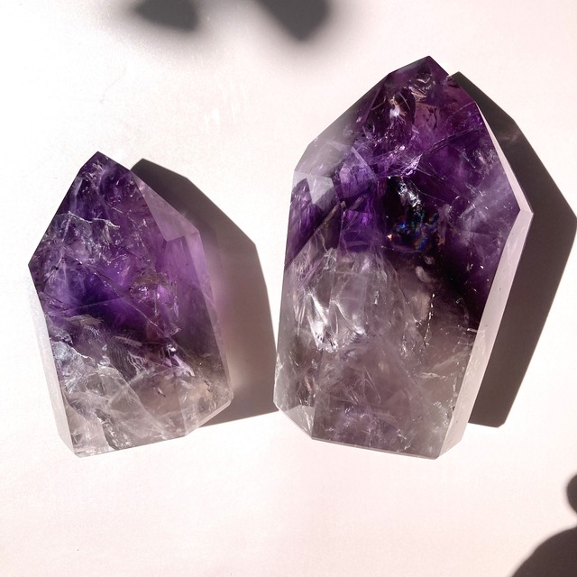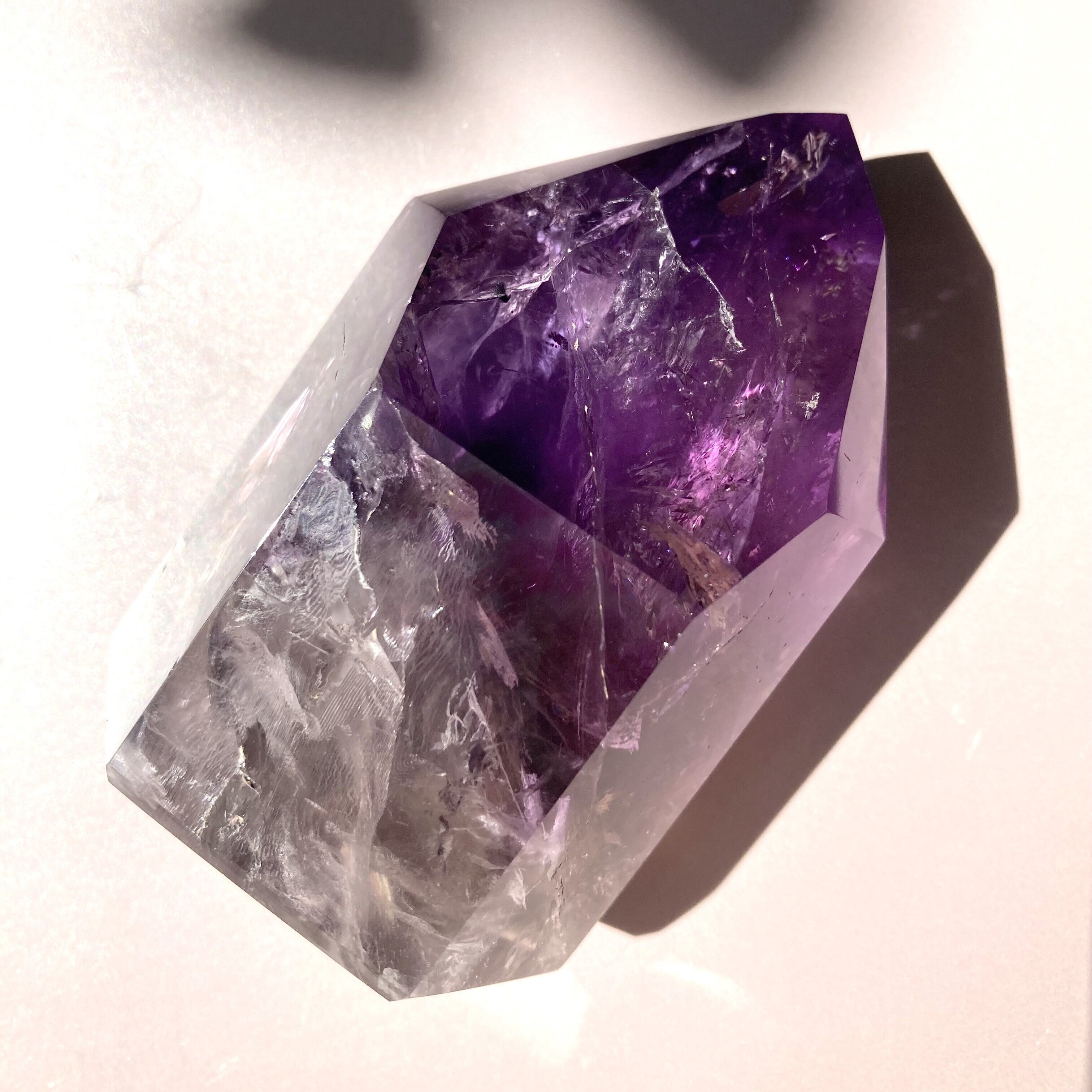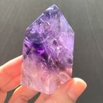 表面をポリッシュされた綺麗なアメジストのポイントです。表面の紫色は濃く、レインボーが入っています。掌にすっぽりと収まるサイズですので、握るとその調和のパワーと気高さの両方を感じられる一品です。また、アメジストにはエネルギーの浄化やストレス解消の効果があると言われています。日々の生活に癒しや幸福感を取り入れたい方におすすめです。一点だけでもお部屋にアクセントを与えてくれます。