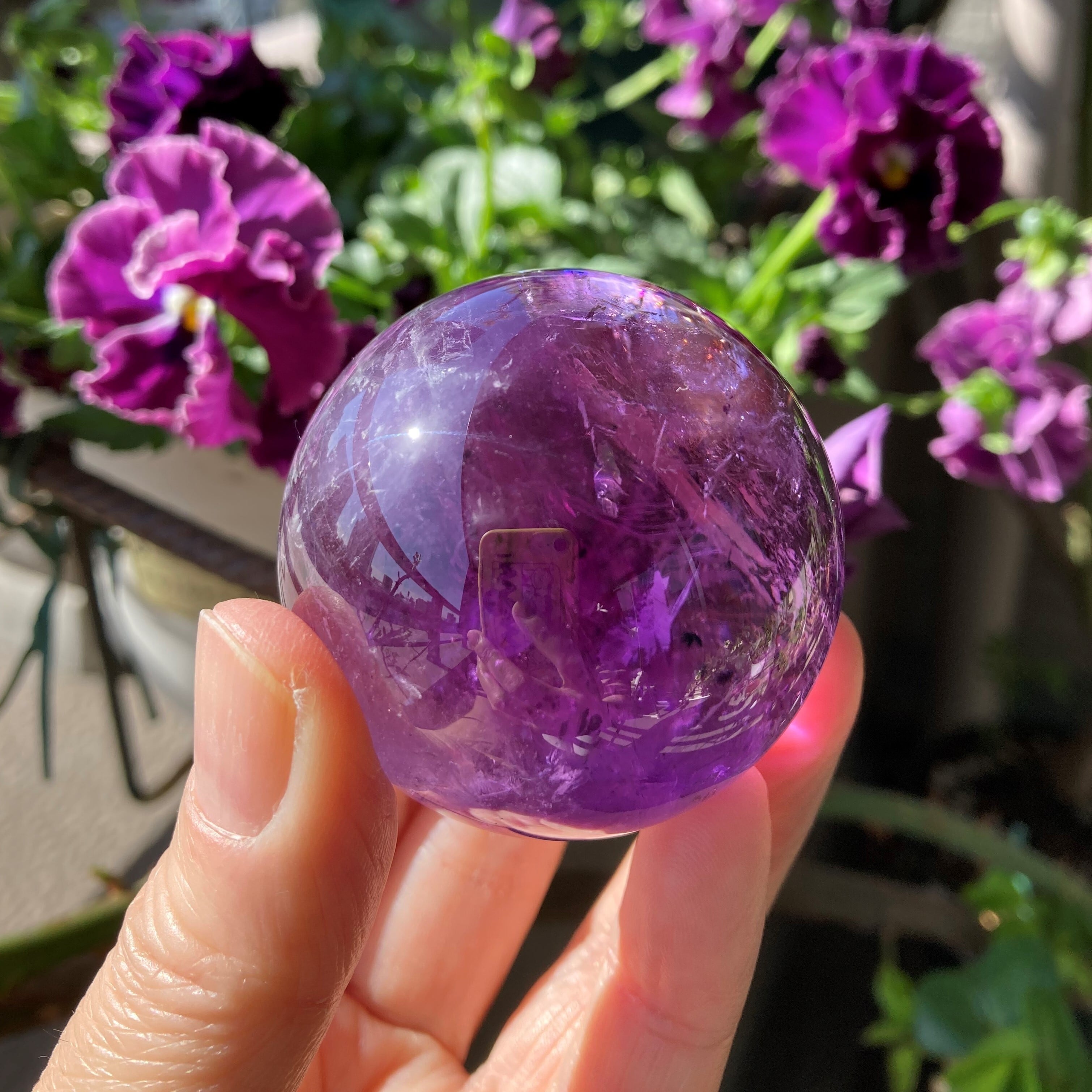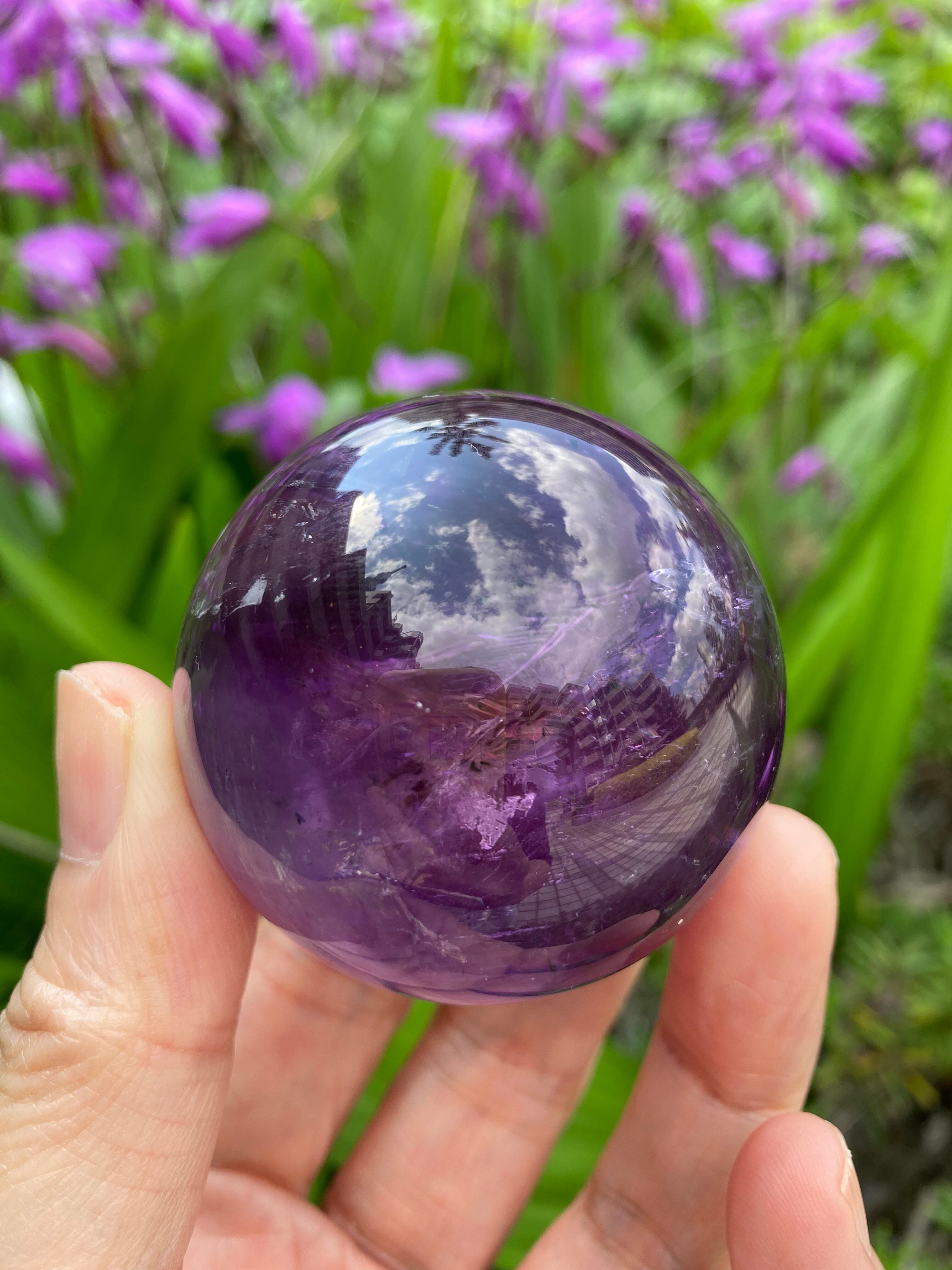 深みある光沢が素晴らしく、写真撮影は大変苦労しました。光を当てると、虹が出て、丸玉の中がより幻想的になる一品です。ずっと見ていると、恐怖や不安が取り除かれ、気持ちが安定してきます。アメジストのいろいろな表情を楽しめます。