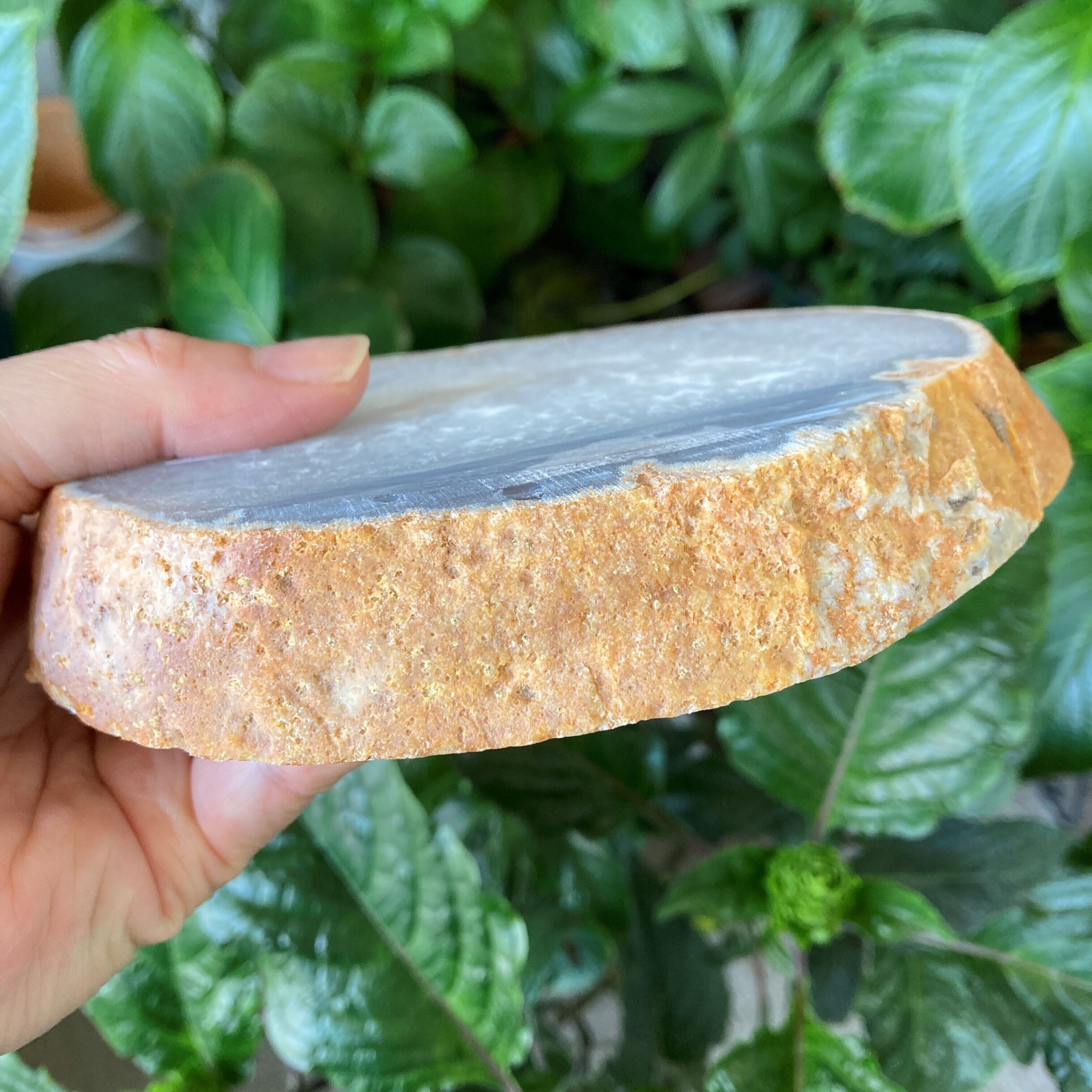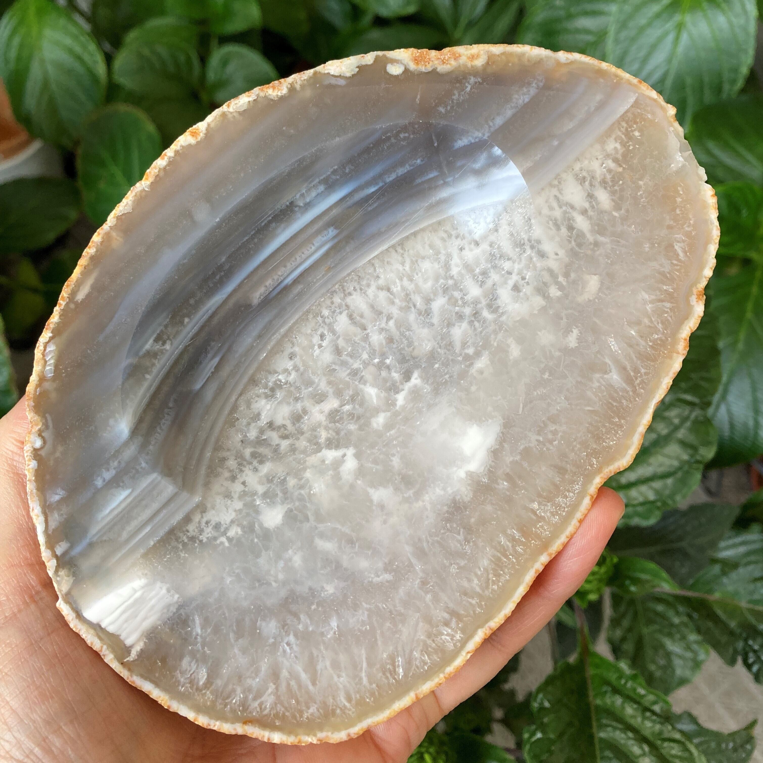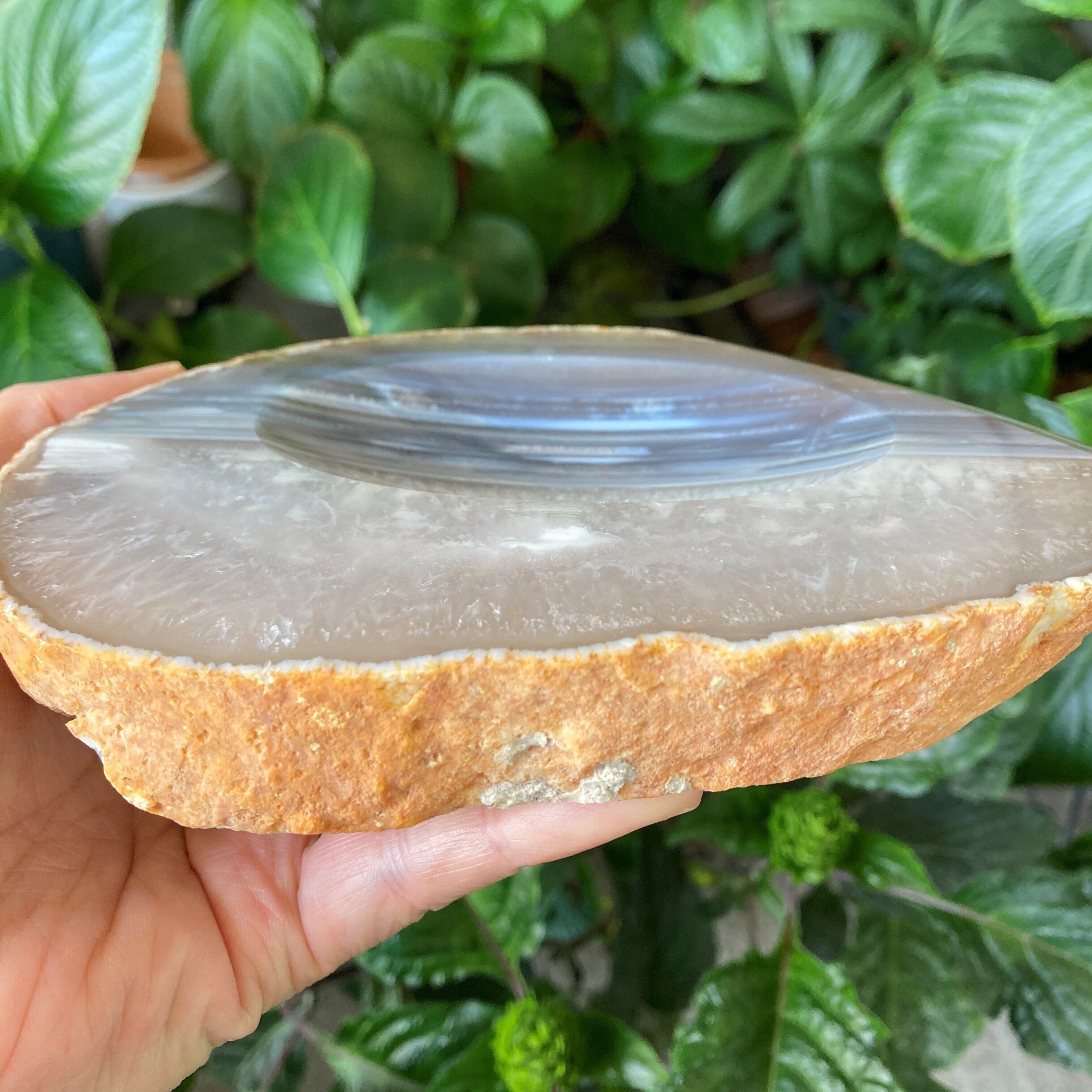 めのう(アゲート)のソープディッシュ。大きめで厚みがあり、ずっしりとして結晶もたくさん見られ、かなり豪華です。染色していない、自然のそのものの「めのう」です。ソープディッシュの名の通り中央部に凹みがありますので、平たいお皿ではありません。使い道はいろいろ。そのまま石鹸を置くのもいいですし、お香のお皿として使ってみては? 凹みにさざれを置いて小さなスフィアを乗せても素敵です。パームストーンを置くにはぴったりサイズかもしれません。素敵にインテリアとしてお楽しみいただけます。