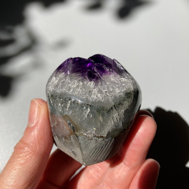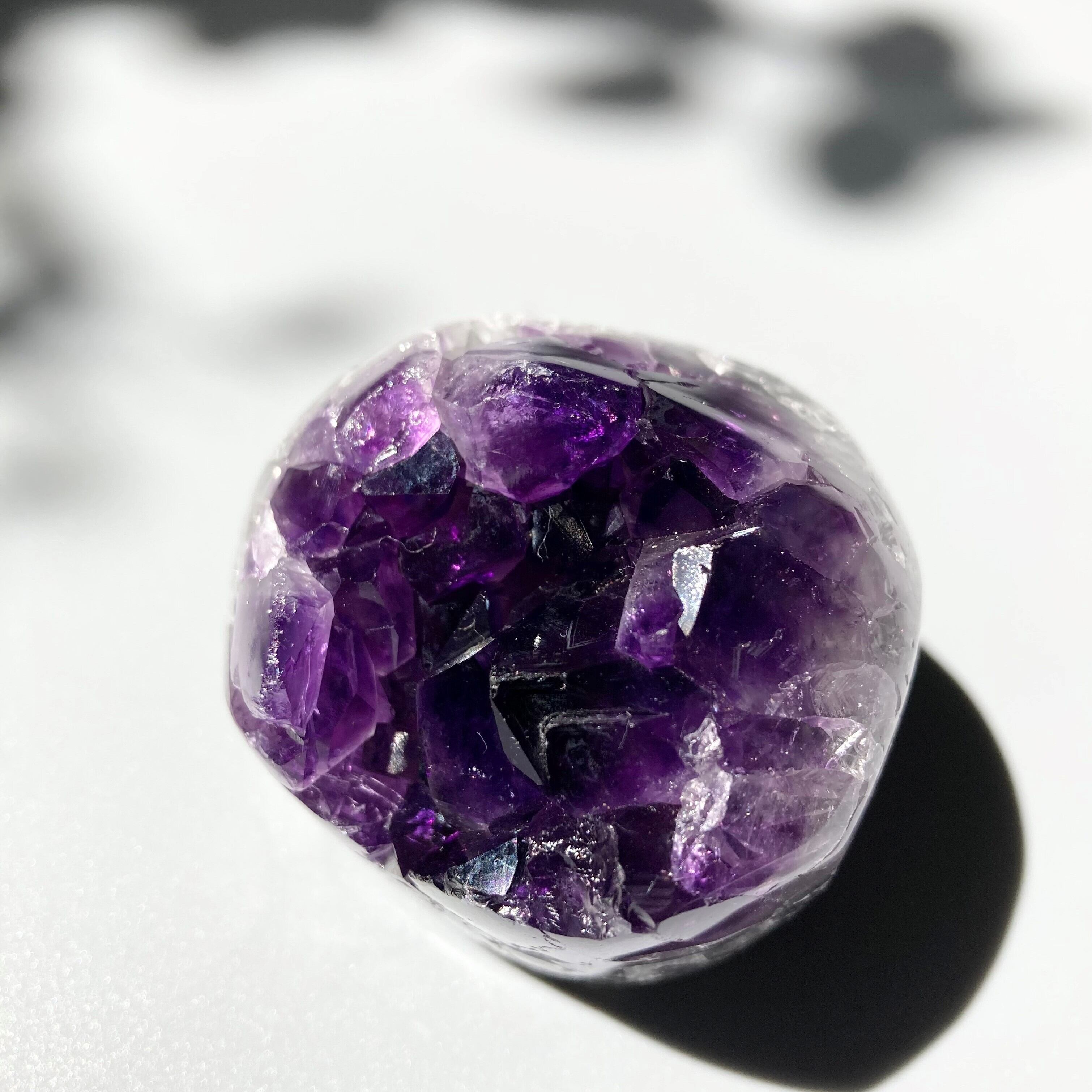 当店自慢の深い紫色に艶やかな光沢、アメジストの神秘的な雰囲気を小さくても十分に持っています。つぼみをイメージした愛らしいフォルムが魅力的で、底切りの為座りは問題ありません。お部屋のインテリア小物としては最適で、また紫色の輝きは、癒しや安らぎを与え、周りの空気を浄化する効果もあります。見ているだけで、落ち着いた雰囲気になり、愛しさがある一品です。