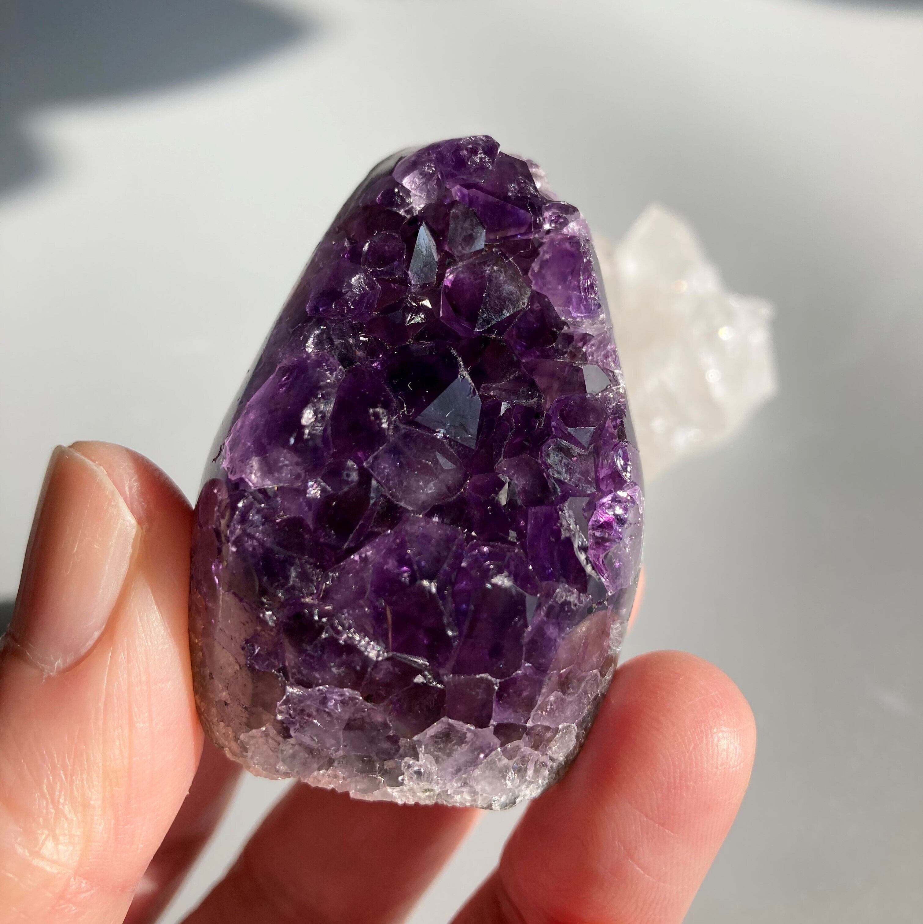当店自慢の深い紫色に艶やかな光沢、そして一つ一つの結晶の粒が揃ったアメジストクラスターに、なんと透明感と煌めきが素敵な、小さくもトマスゴンザガ産水晶クラスターをセットにしました。称してミニミニ大作戦!!。両方ともとても小さくてかわいく、お部屋や机の片隅にあなた様だけの癒しスポットが出来ちゃうセットです。