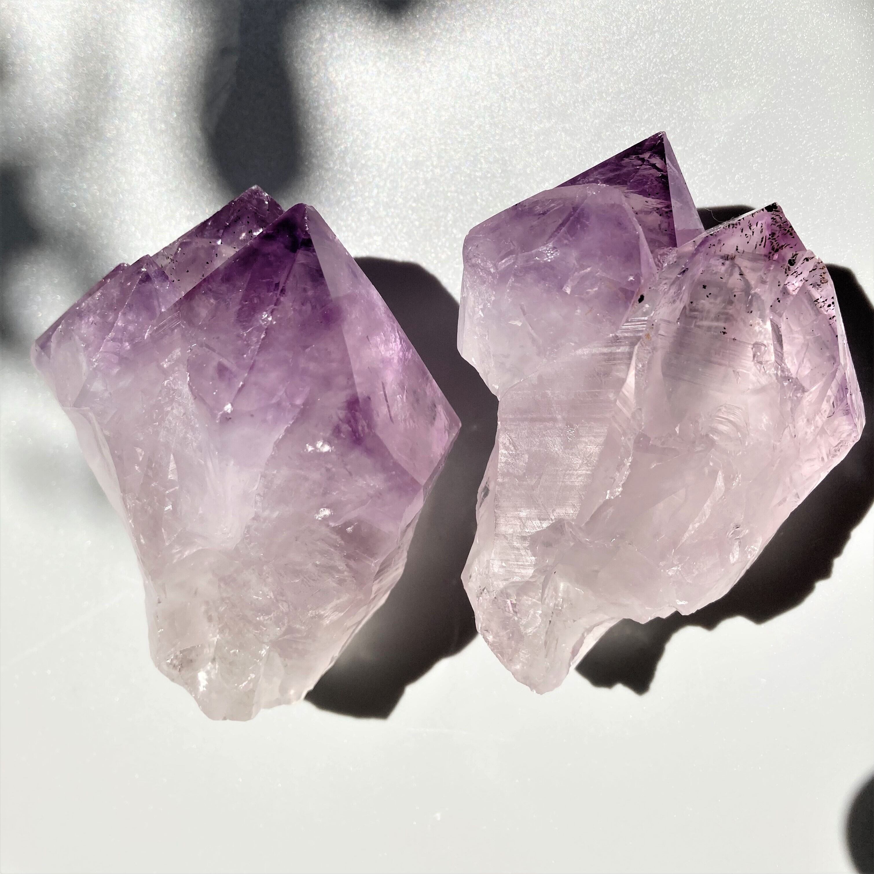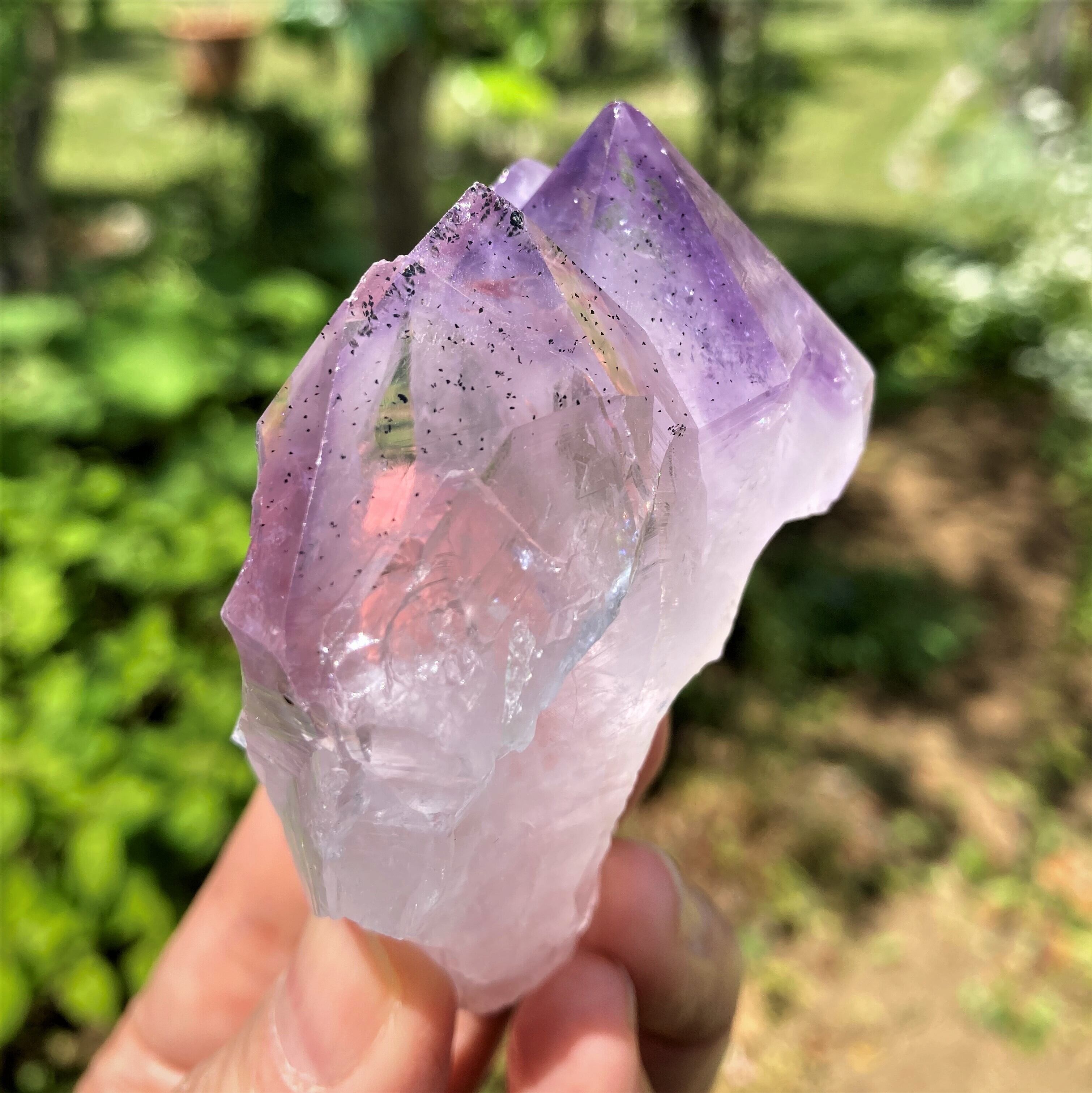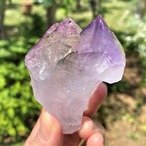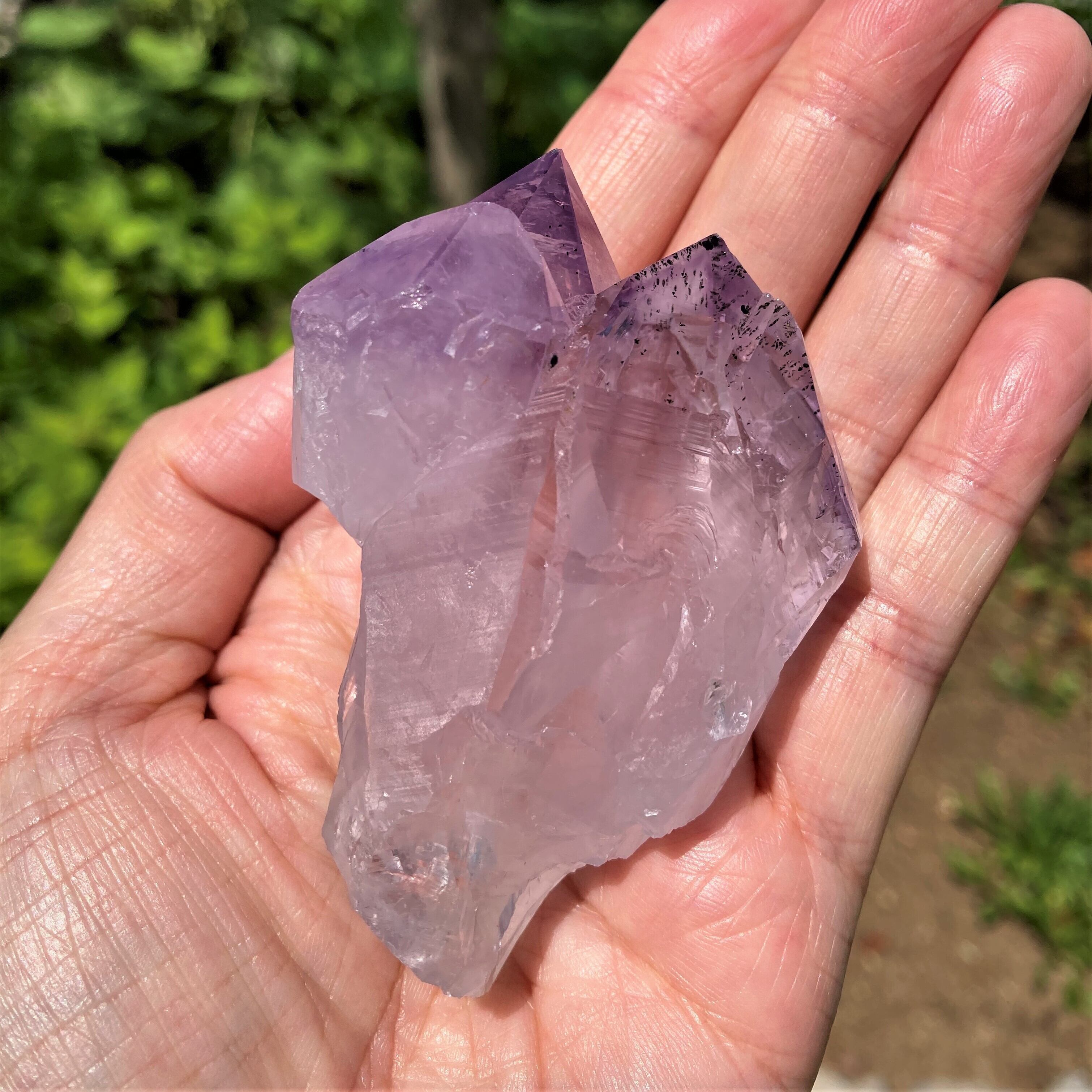 ブラジル産のアメジストの単晶ポイントです。表面の紫色は淡く、元々は水晶だったものが地殻変動や高温・高圧の影響で紫色に変化していく過程にあるような印象のアメジストです。そのため、自然の悠久の力を感じられると同時に豊かなパワーを秘めた一品です。普通のアメジストに満足されていないあなた様へ、お勧めの一品です。