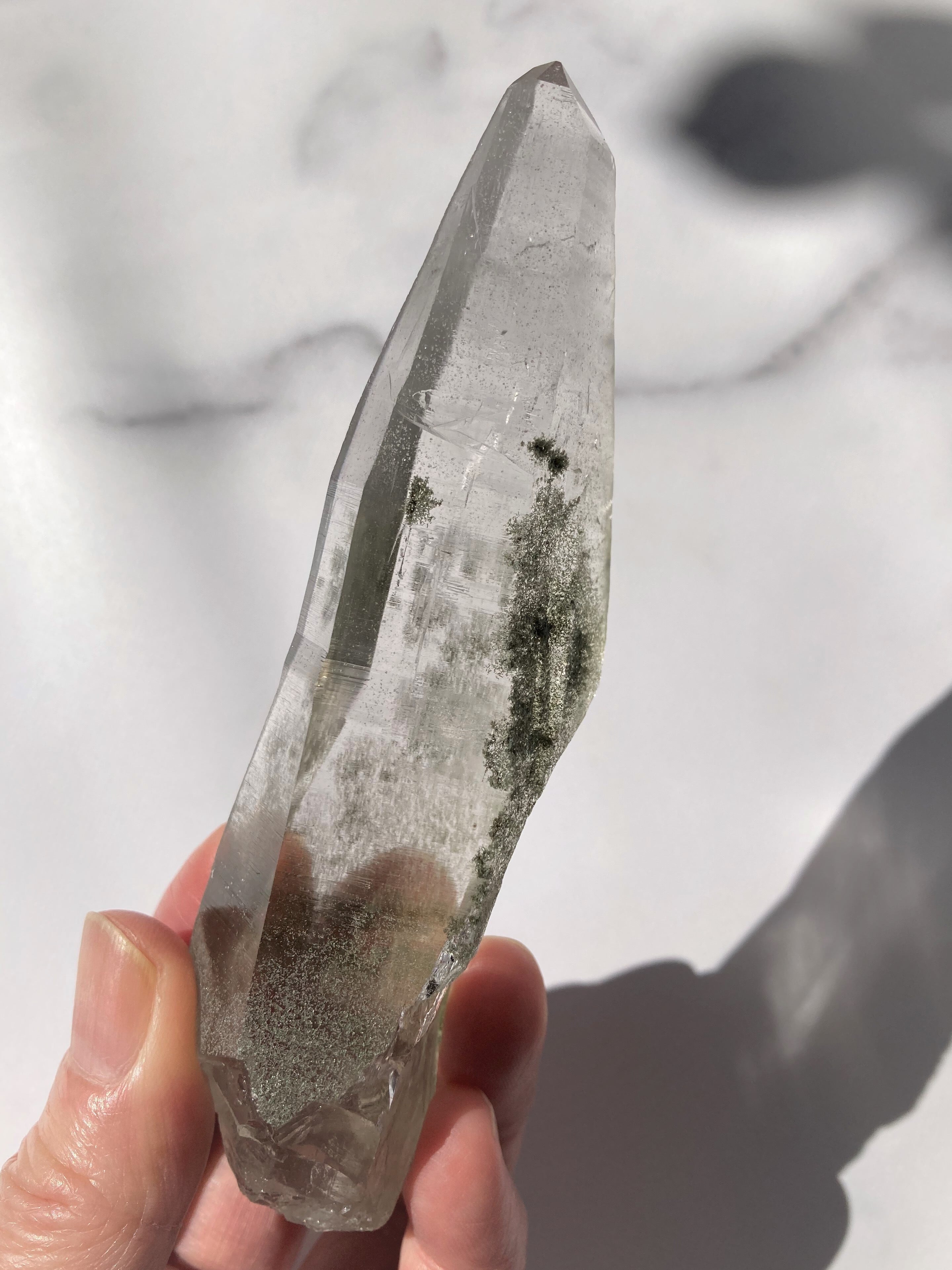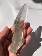 強い波動と美しさを兼ね備えた、希少価値の高いネパール・ガネーシュヒマール産の水晶ポイントを入荷しました。神聖なる水晶には、自己を見つめ、心を浄化する力があります。ガネーシュヒマールで産出されたこの水晶ポイントは自然な形状で、また、クローライト(緑泥石)と呼ばれる緑色の包有物にもヒーリングパワーが宿っており、癒やしと浄化のエネルギーを体感できます。クローライト(緑泥石)は側面に付着していますが、3本の中では一番控え目で、サイズ感が良いので持ち運びやすい一品です。標高5000mにもなるヒマラヤ山中での採掘は非常に厳しく、機械を持ち込めない採取がゆえに、流通量が少ない水晶ポイントです。存在感のある水晶をお求めのあなた様へおすすめです。