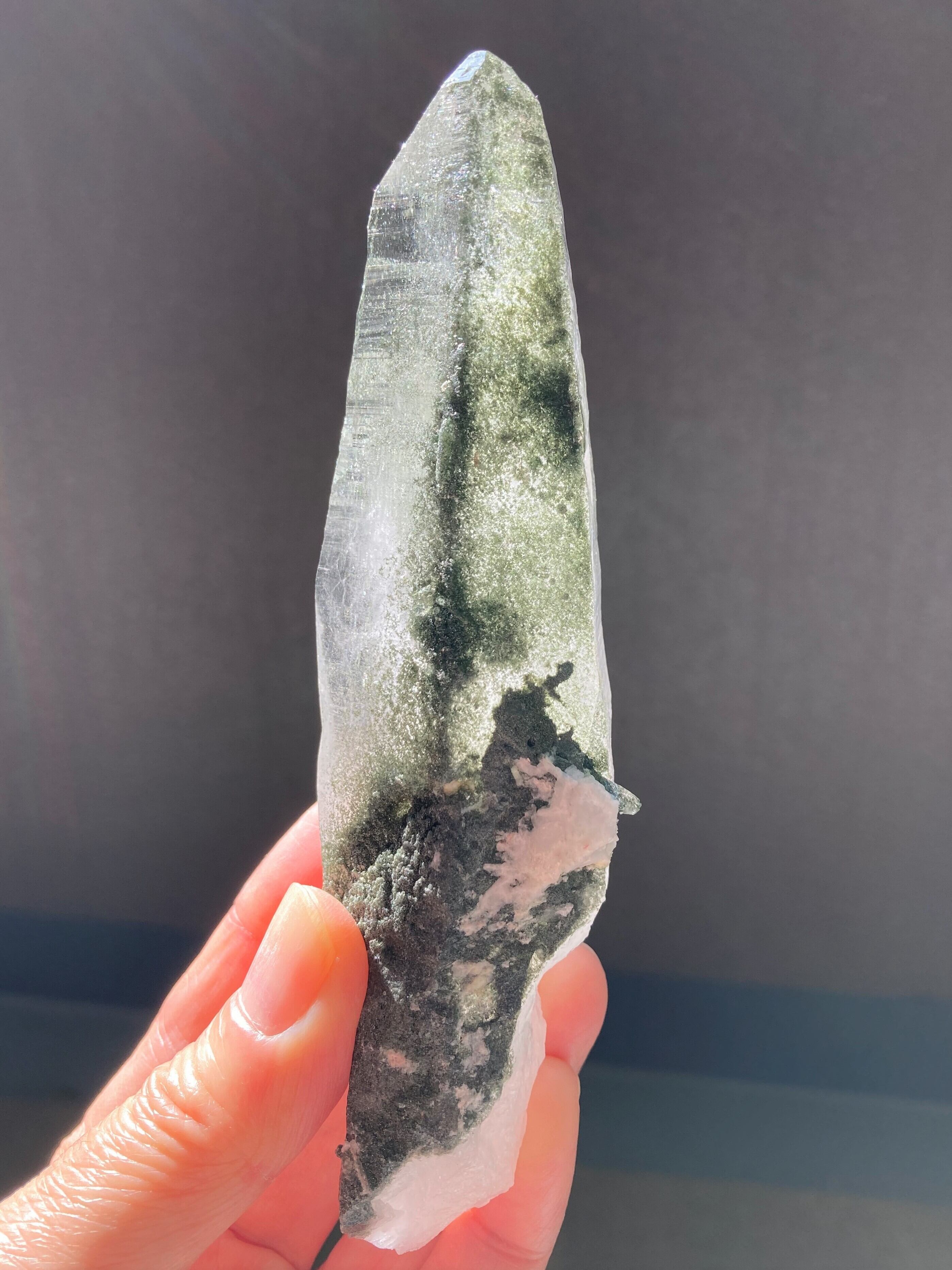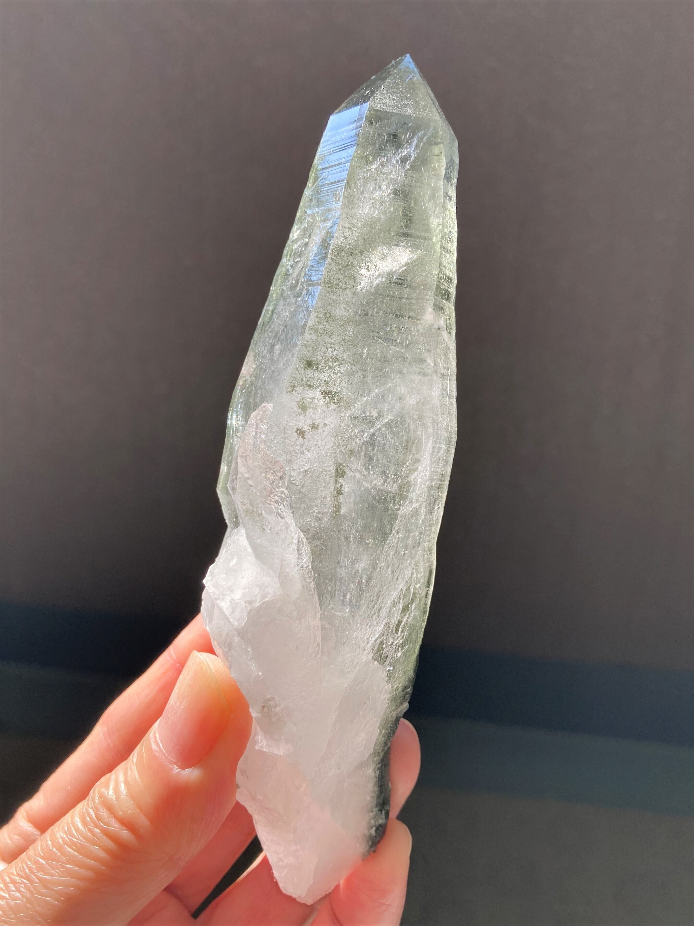 強い波動と美しさを兼ね備えた、希少価値の高いネパール・ガネーシュヒマール産の水晶ポイントを入荷しました。神聖なる水晶には、自己を見つめ、心を浄化する力があります。ガネーシュヒマールで産出されたこの水晶ポイントは自然な形状で、また、クローライト(緑泥石)と呼ばれる緑色の包有物にもヒーリングパワーが宿っており、癒やしと浄化のエネルギーを体感できます。この水晶ポイントは自然な形状で、側面と根本部分にクローライト(緑泥石)が緑色の砂ように付着していますので、透明度は少し低いです。典型的なヒマラヤ産水晶で、剣のような細長いサイズ感です。標高5000mにもなるヒマラヤ山中での採掘は非常に厳しく、機械を持ち込めない採取がゆえに、流通量が少ない水晶ポイントです。存在感のある水晶をお求めのあなた様へおすすめです。
