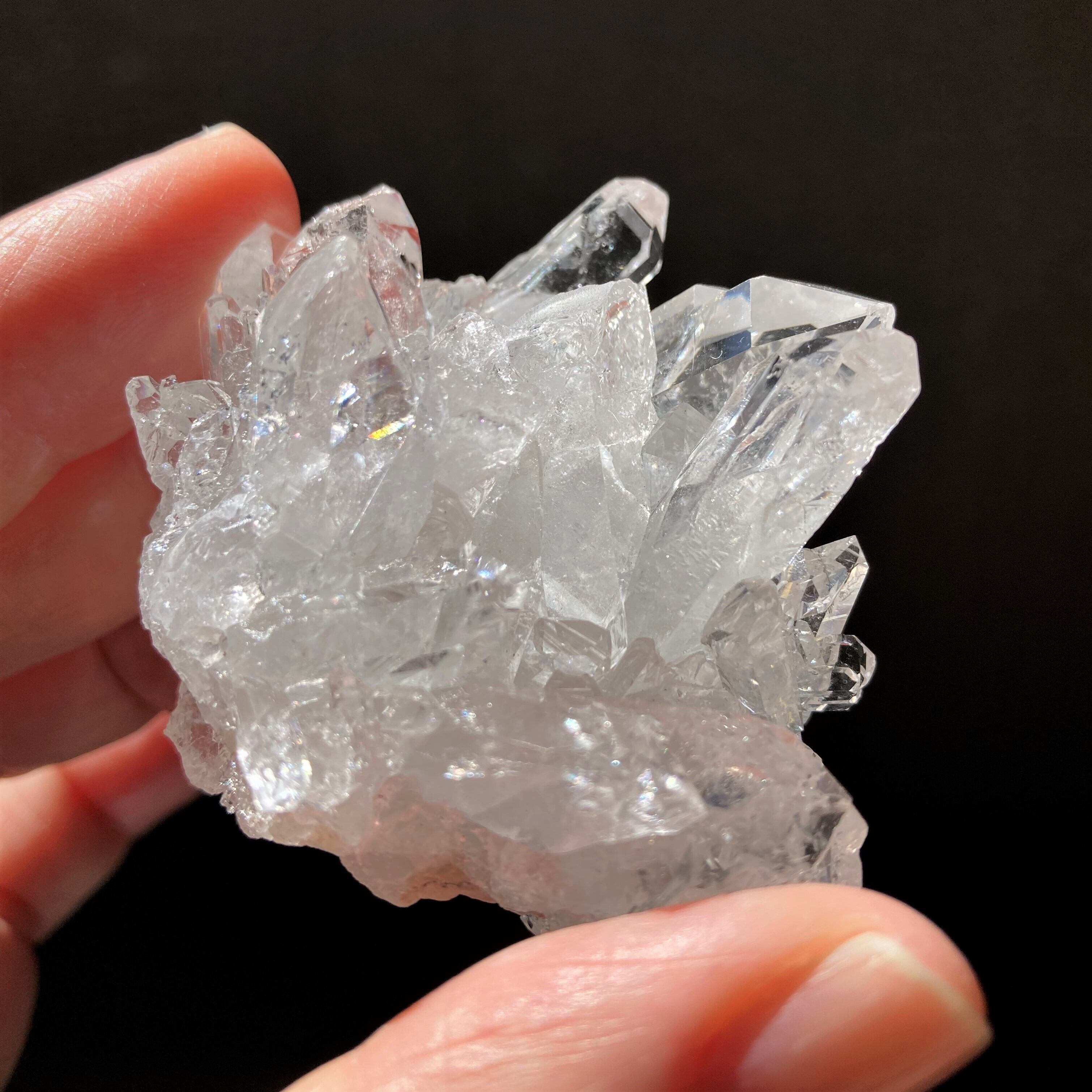 透明感あふれるブラジル・ゼッカジソウザ産のミニクラスターです。水晶の剣先が全方向に複雑に絡まりあうように出ていますので、360度どの方向から見てもその煌めきを楽しめる一品です。60gの小ぶりなサイズ感の中にでも自然が生み出した造形美に感動してしまいます。360度どの方向からも楽しめる一品は、あなたを幸せを見守るように輝いてくれます。是非この子をお迎えください。