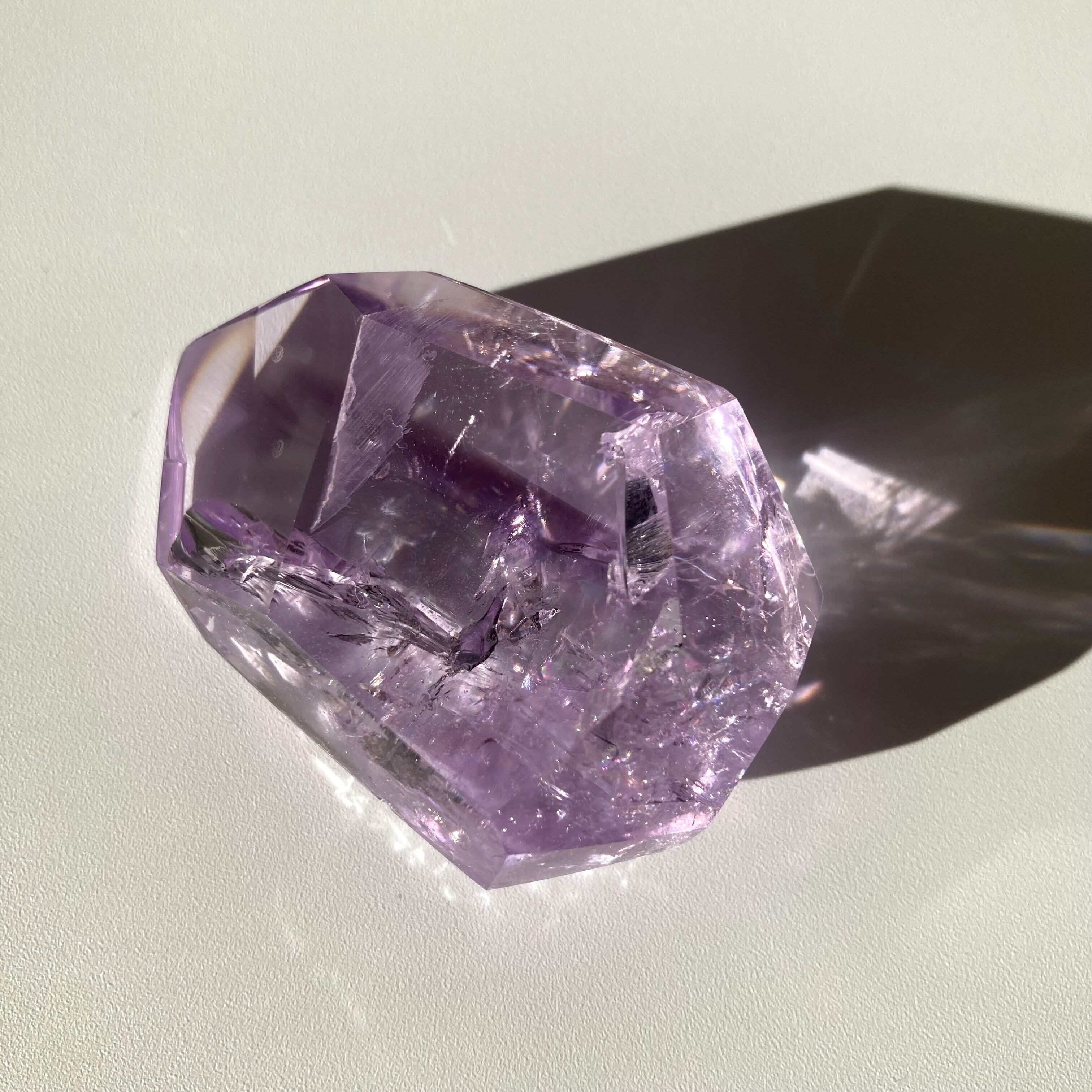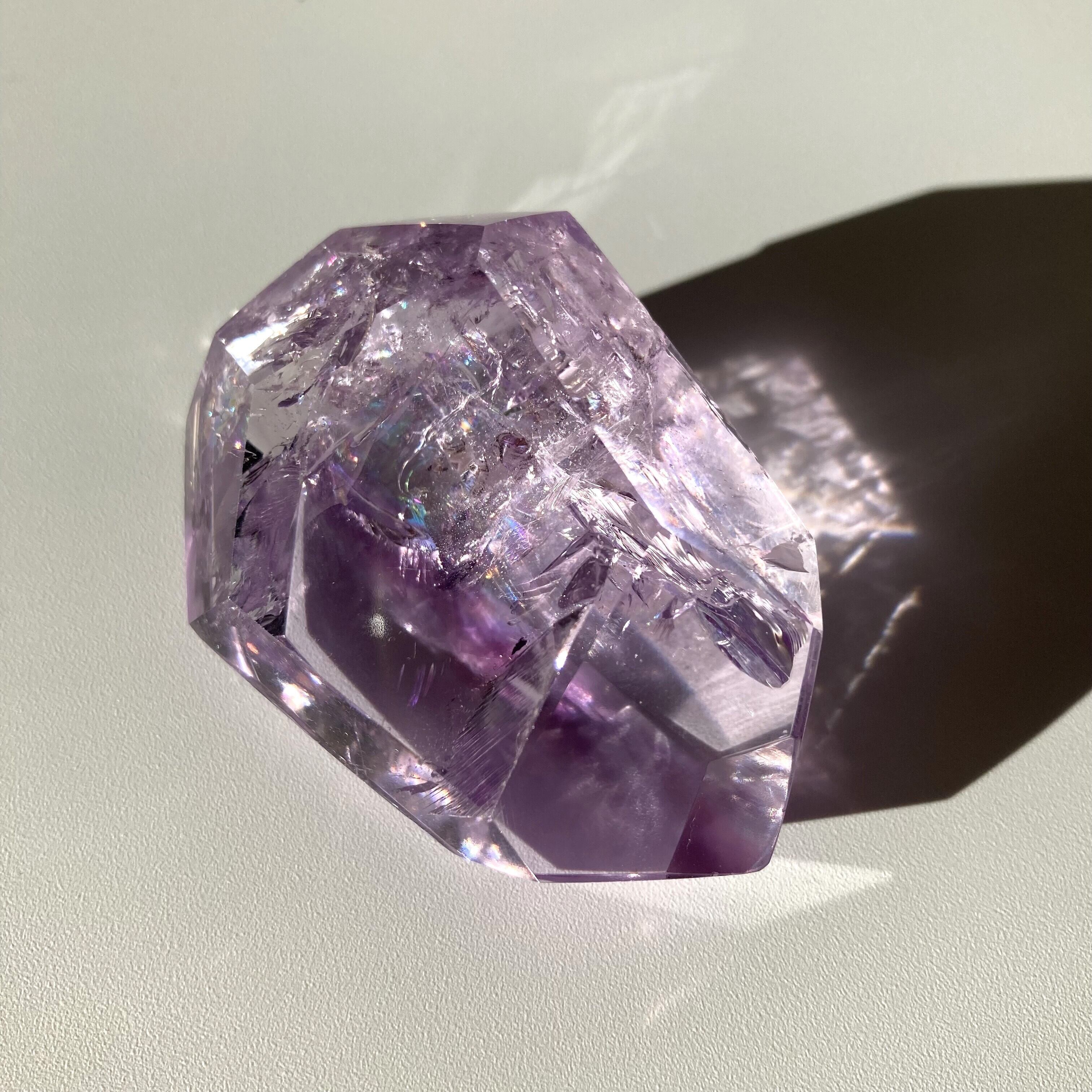 ブラジル産アイリスアメジストフリーフォームです。透明度が高く、うす紫色で、写真で伝えきれない美しい虹が見えます。手のひらに収まるほどのコンパクトさですが、美しい虹と自然の造形美の可愛さに癒される一品です。手のひらサイズですので、いつでも・どこでもこのアメジストに癒されて、穏やかな日々をサポートしてくれることでしょう。
