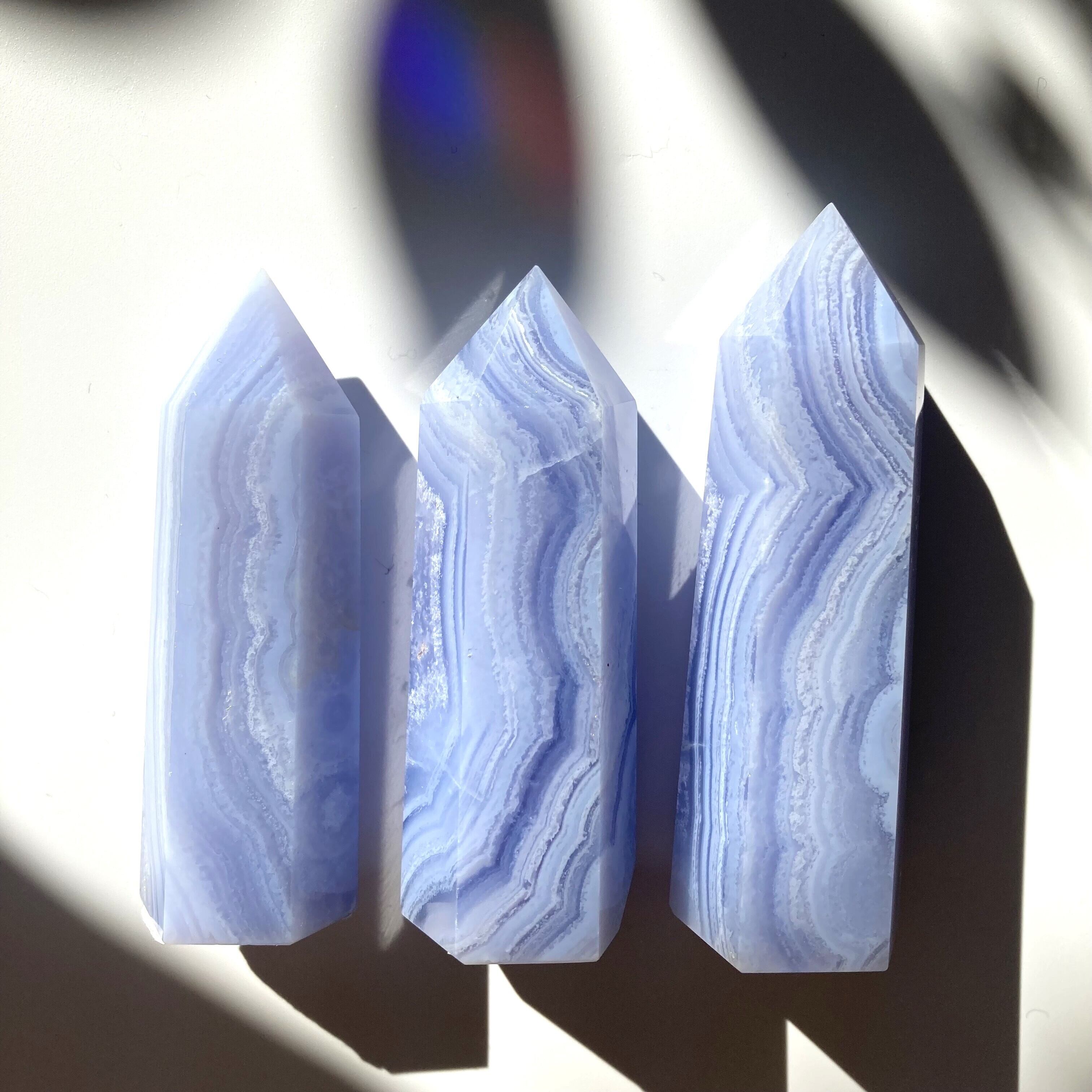 ブルーレースアゲートは、水色の瑪瑙に縞模様が入っている天然石です。淡い水色や白色が層状に重なって、まるでレースのように見えることからこの名が付けられました。和名も「空色縞瑪瑙(そらいろしまめのう)」と言い、日本人も海外の方も同じ感性で名付けられているのも興味深いです。今回のご紹介する一品は特に縞模様がはっきりしていて、白色部分がまるで雲のような印象のものを集めてみました。淡いブルーを見ていると、ストレスや感情の乱れを取り除き、リラックス効果を感じて頂けます。落ち着かない日、なぜかイライラする時は、この石をじっと見つめてみていると、青空の中に吸い込まれていくような心地よいイメージが心に広がり、自然と気持ちが落ちついてきます。