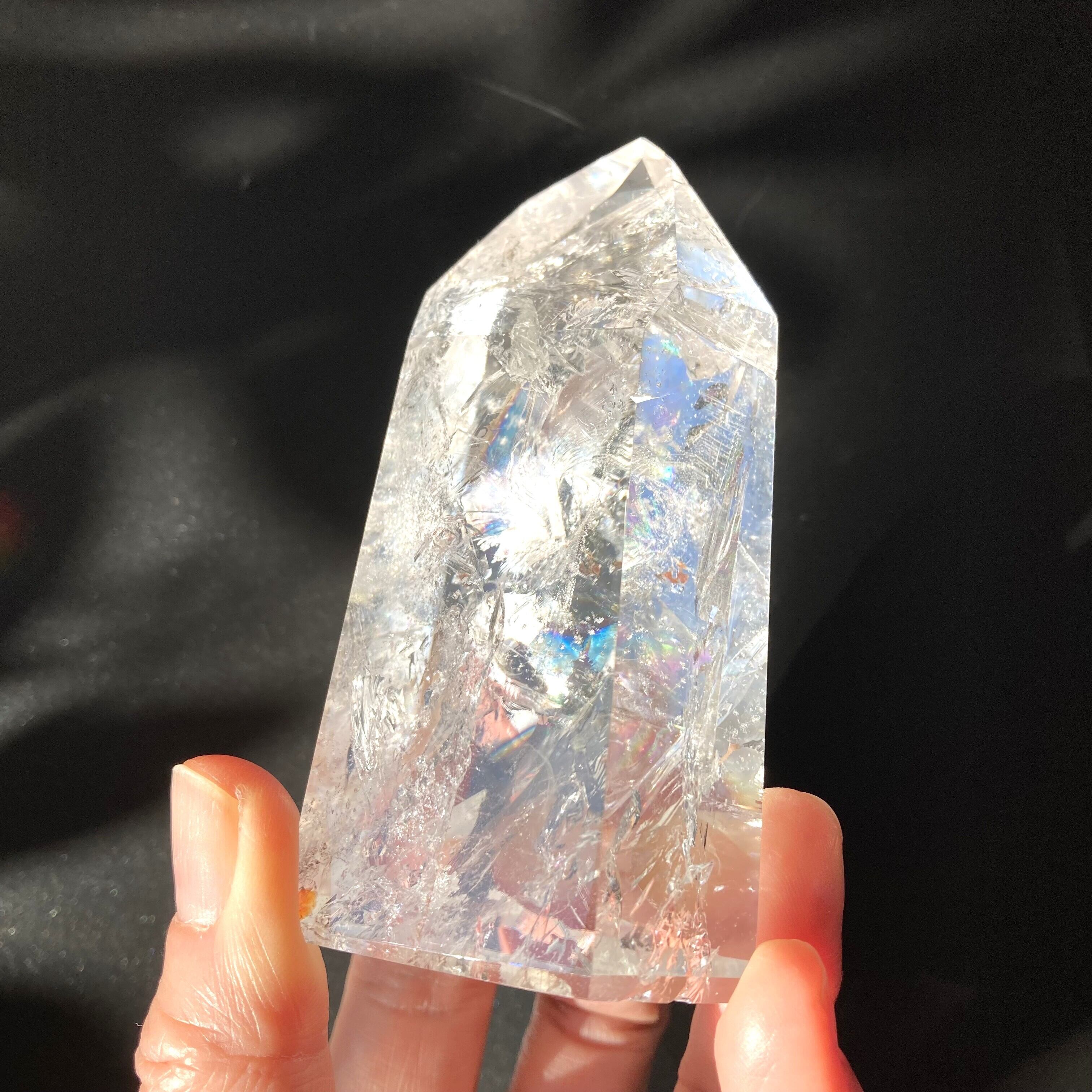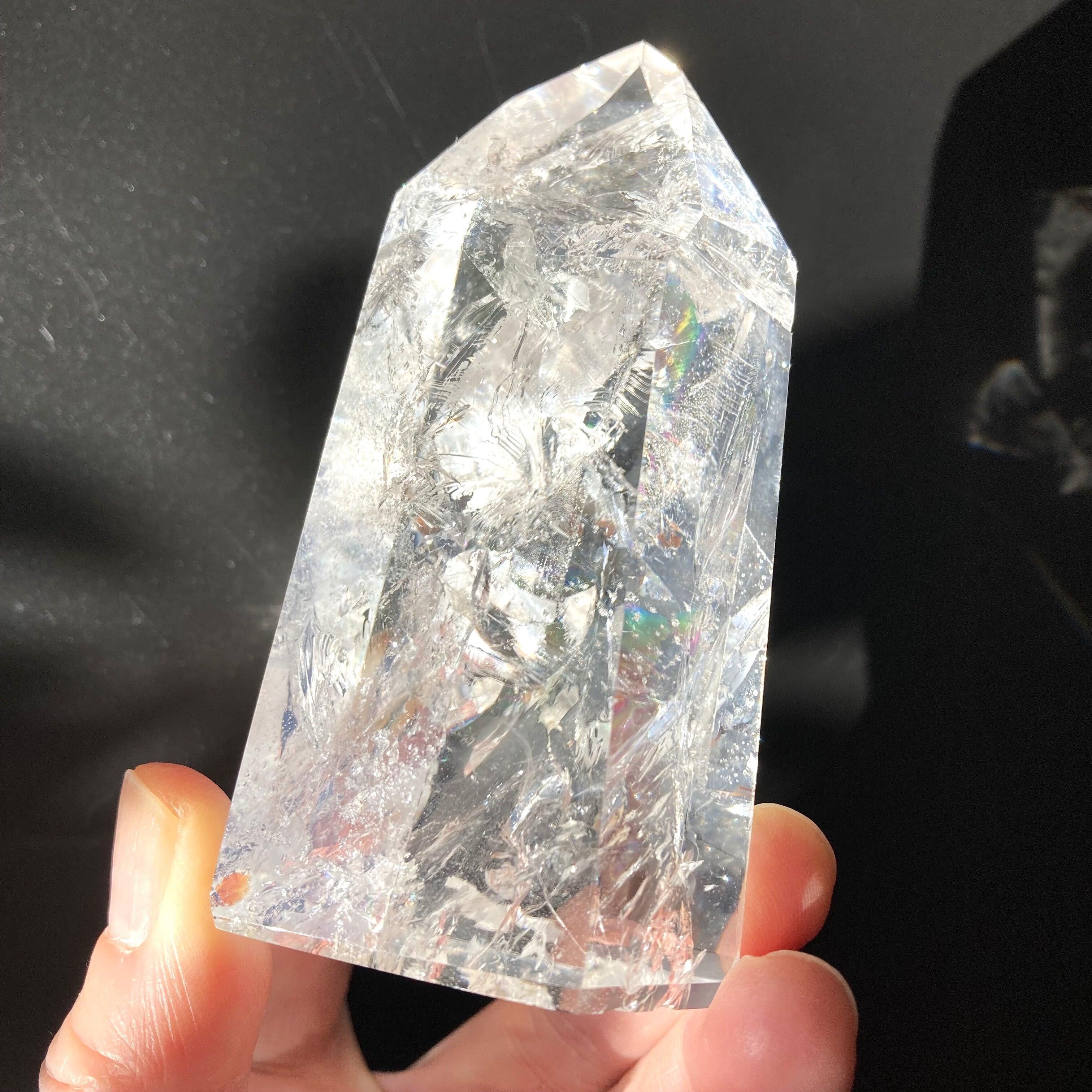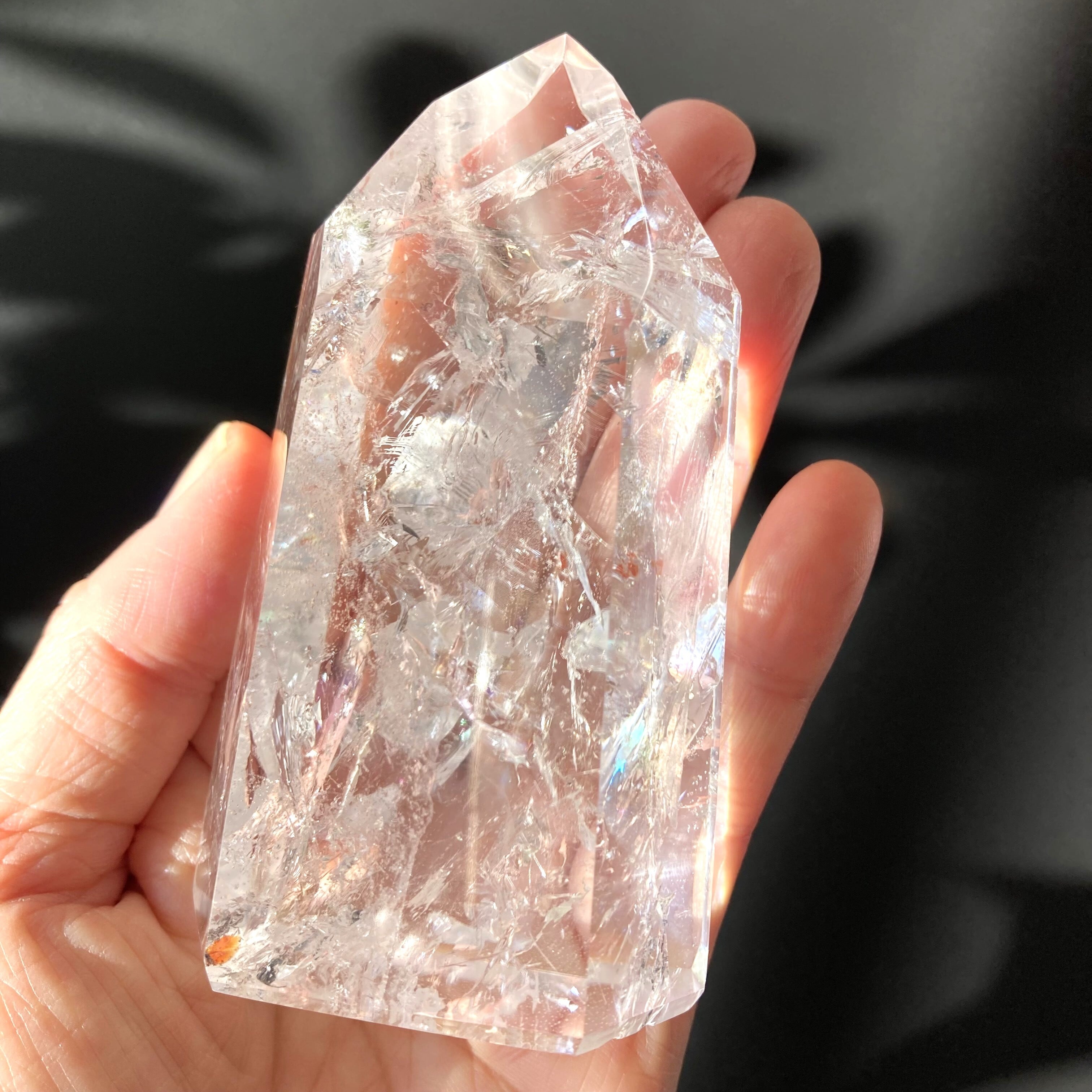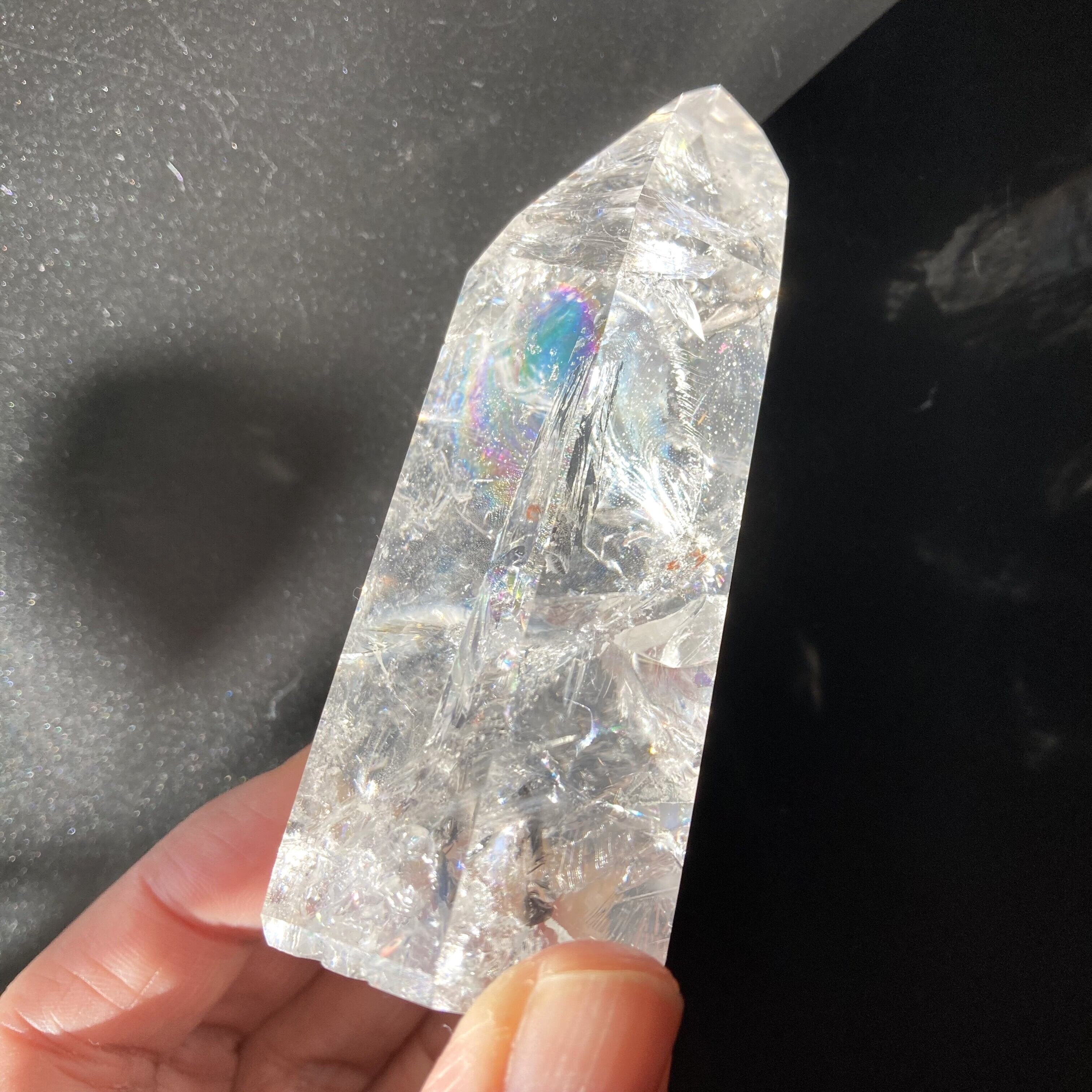 バイーア・アレグリ産の高品質のレムリアン水晶ポリッシュポイントです。透明感のあるクリスタルが放つ輝きには、まさに自然のエネルギーが宿っています。光に当てるとたくさんの虹を見ることができますので、その美しさにただ見ているだけで癒されてしまいます。虹色の反射が美しいので、空間にパワフルなエネルギーを広げてくれるだけではなく、持ち主様のエネルギーも高めてもらえます。サイズ感も贅沢で存在感のある素晴らしい一品です。あなたのお守りとして、また贈り物としてもぜひご利用ください。