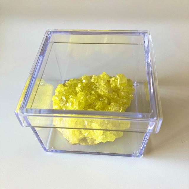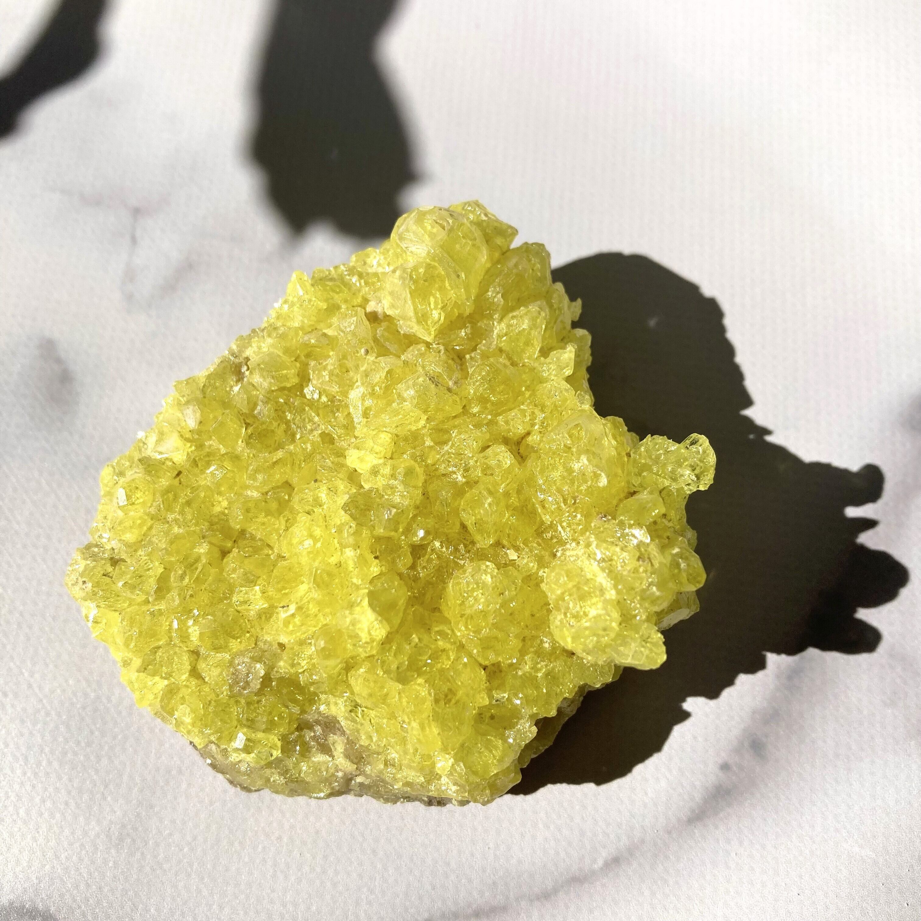 鮮やかなレモンカラーが特徴のボリビア産・サルファーを入荷しました。サルファーの和名は、硫黄で、それが結晶化し、とても鮮やかな黄色が特徴です。火山の火口や、温泉の噴出孔付近から産出します。この子に鼻をつけると硫黄の香がするので、いつでも温泉気分。でも、お水での浄化は、硫化水素を生み出すのでおやめください。それと熱にもデリケートなので、太陽光の浄化もおやめください。また、ポロポロと崩れやすい為、取扱いには十分ご注意下さい。透明感のある綺麗なレモン色に癒されて下さい。