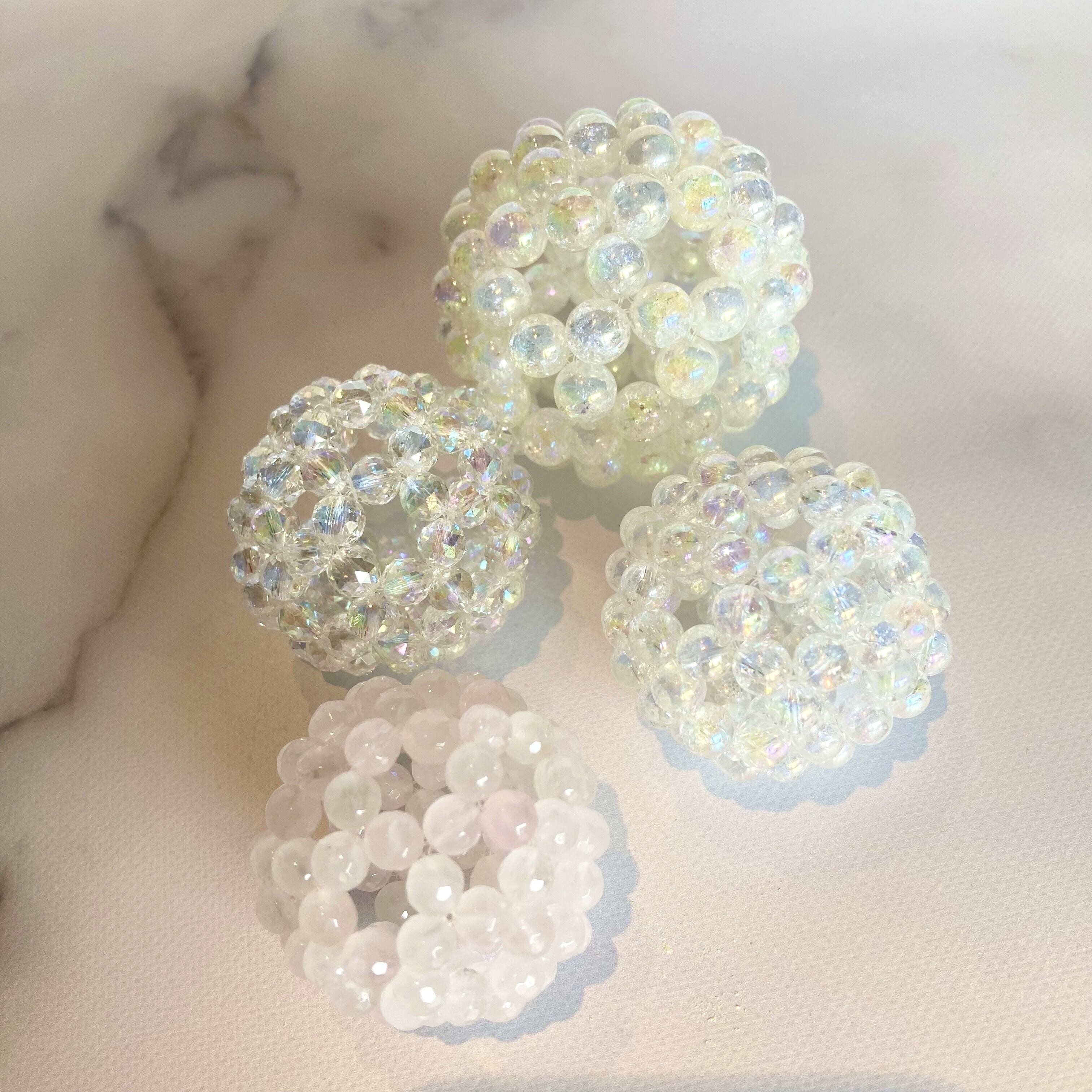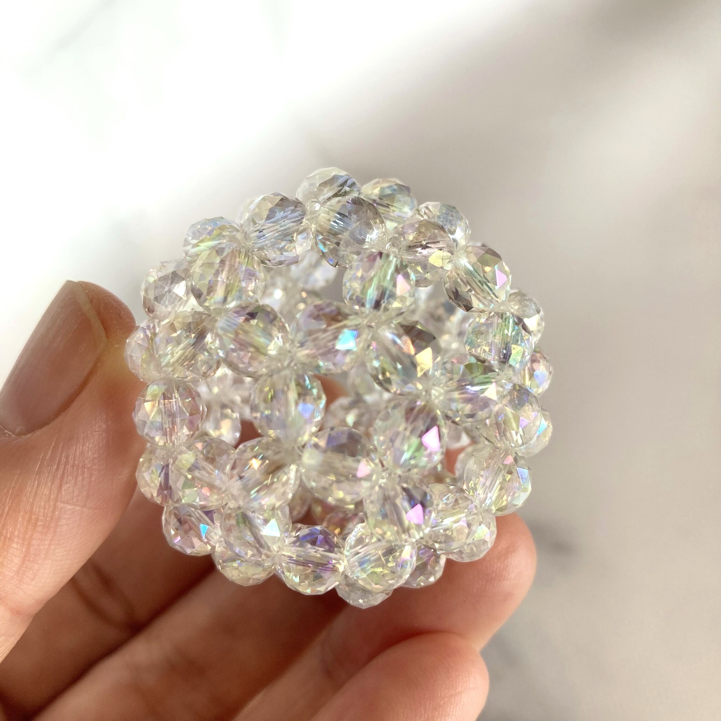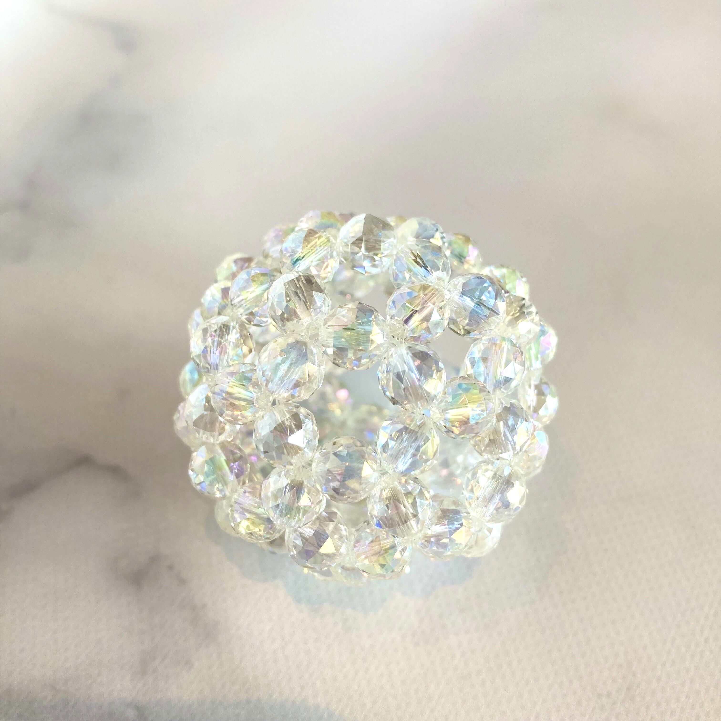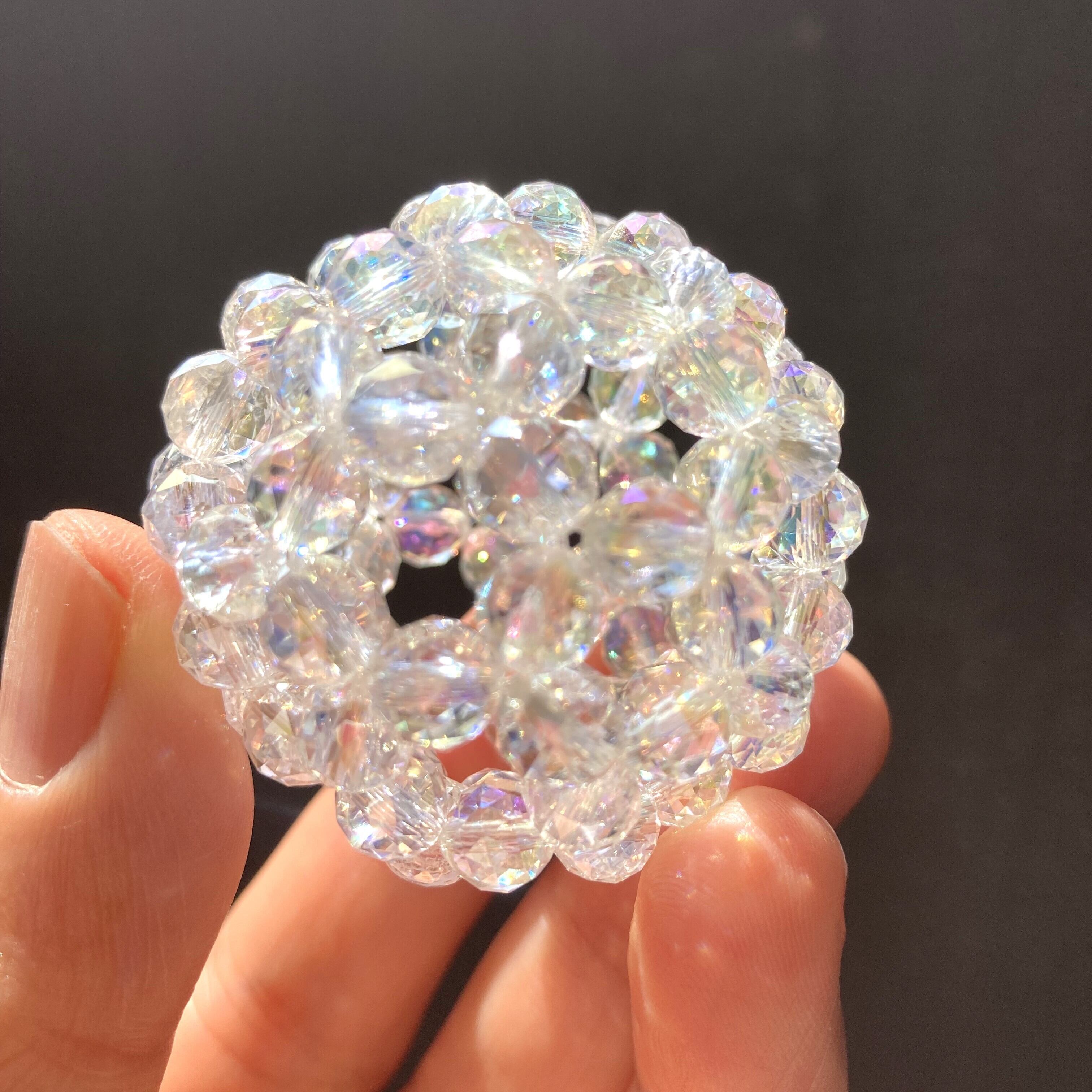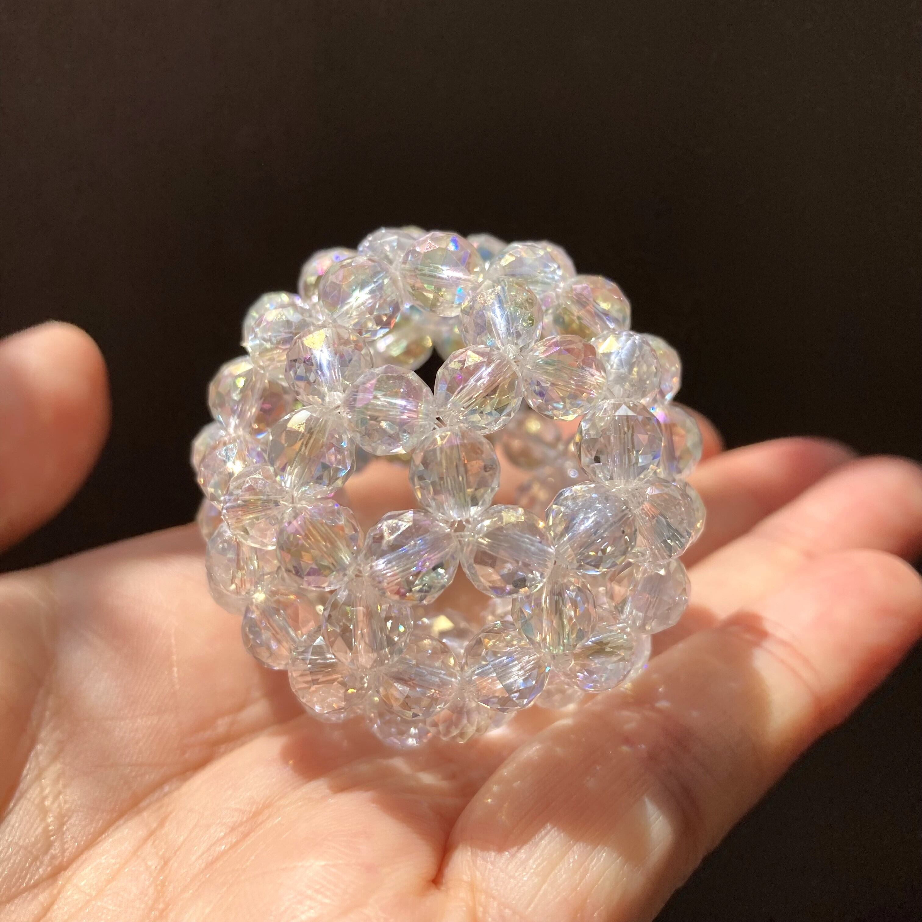 96面トライアングルカット水晶(6ミリ)90粒で手作りしたバッキーボールです。バッキーボールは32面体の形状で、周囲に放つエネルギーはとてもピュアで、90粒の水晶に一つ一つ丁寧にカットされているので、レインボーのような美しい輝きと色の変化を楽しめます。インテリアとして飾るだけでなく、瞑想や癒しの空間作りにも最適です。その美しさに見とれながら、心と身体の浄化やバランスを整えて下さい。