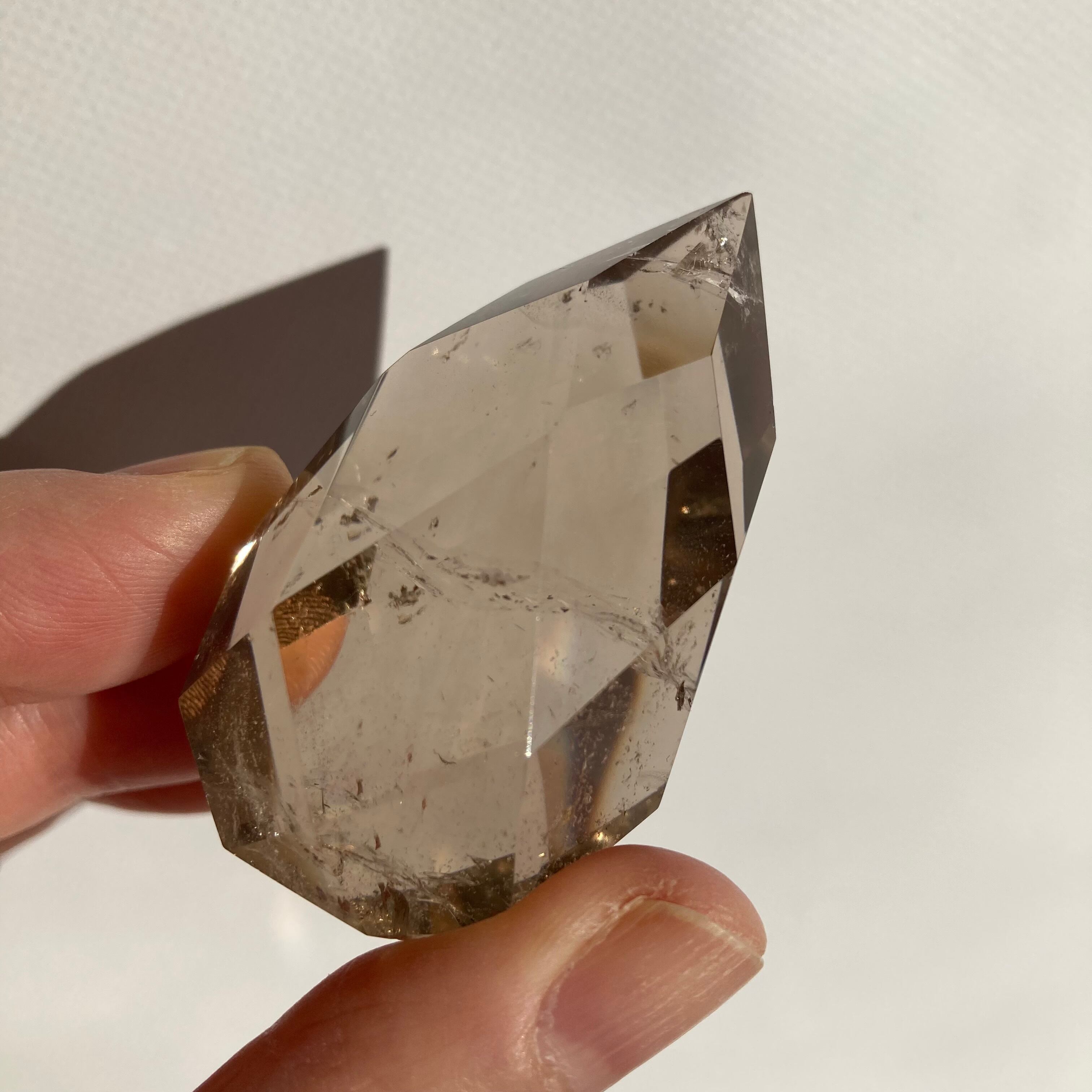 透明感のある水晶とは違うスモーキー(煙がかった)なクオーツですが、輝きは水晶で、独特の光沢があります。スモーキークォーツは、負の感情を取り除くヒーリング効果があるので、邪念や邪気を取り除き、気持ちをリラックスさせてもらえます。古くから邪気から身を守る守護石、魔除けとして利用されていましたので、持っているだけで大きな安心感を与え、生きることの喜びや充実感に繋がっていくと思います。それに何と言っても卵型(しずく型)にカットされ、煌びやかにカッティングされているのがキラキラととても可愛い一品です。卵型の大きさが手にしっくりと馴染み、持つだけで心が穏やかに満たされるような安らぎを与えてくれます。